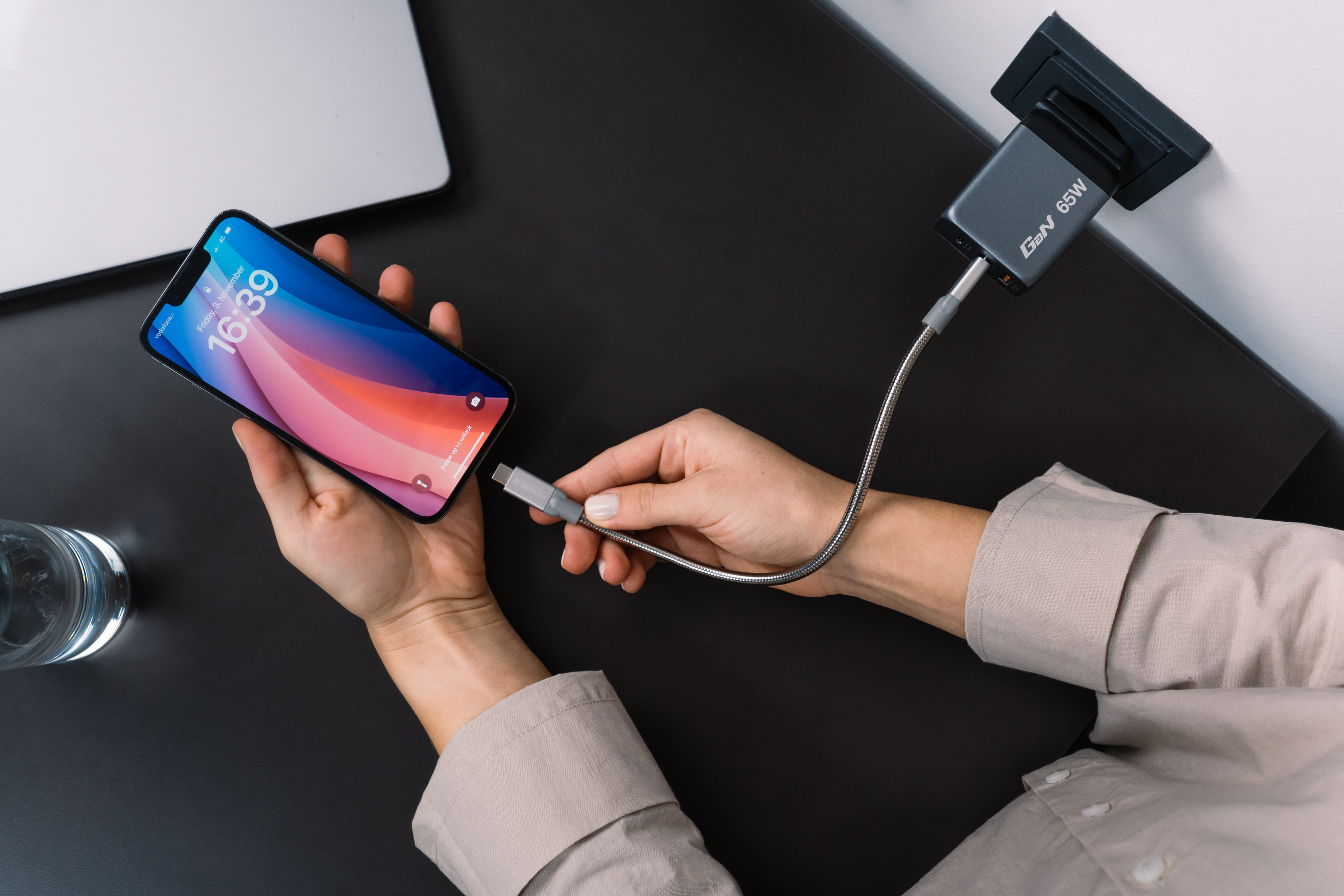 Le chargeur 65 W-GaN de Verbatim combine deux ports USB-C PD 65 W et un port USB-A QC-3.0 dans un design fin, de la taille d'une main. Ce chargeur est donc idéal pour charger des ordinateurs portables, des tablettes, des smartphones, des consoles de jeux, etc. au bureau, à la maison ou en déplacement.<br>Avec ses broches américaines rétractables et ses prises interchangeables pour l'UE et le Royaume-Uni, ce chargeur est le compagnon de voyage idéal.<br>La technologie au nitrate de gallium (GaN) permet une charge rapide et efficace avec une puissance élevée et une chaleur réduite. Comme les chargeurs GaN sont plus petits et plus légers que les chargeurs traditionnels à base de silicone, ils sont extrêmement faciles à transporter et idéaux pour les déplacements.<br>Le chargeur GaN est fabriqué à partir de matériaux ininflammables de haute qualité et est équipé de quatre systèmes de protection : Protection contre les surintensités, protection contre les surtensions, protection contre les courts-circuits et protection contre la surchauffe. Ainsi, vous êtes en sécurité lors de la charge.